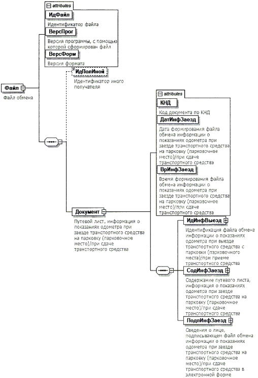 | Идентификатор файла обмена информации о показаниях одометра при заезде транспортного средства на парковку (парковочное место)/при сдаче транспортного средства другому водителю | ИдФайлИнфЗаезд | A | T(1-255) | О | Содержит (повторяет) имя файла обмена информации о показаниях одометра при заезде транспортного средства на парковку (парковочное место)/при сдаче транспортного средства другому водителю |