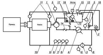 1 - главный масляный насос, приводимый валом основного насоса; 2 - клапан регулировки давления; 3 - полнопоточный фильтр; 4 - маслоохладитель; 5 - термометр; 6 - манометр; 7 - сигнализатор понижения давления и выключатель (двигателя); 8 - кнопка запуска главного насоса; 9 - вспомогательный насосный мембранный переключатель; 10 - трубопровод (подвода и отвода); 11 - визуальный поточный индикатор; 12 - масляная ванна; 13 - вспомогательный масляный насос; 14 - запорный клапан; 15 - уровнемер масла; 16 - предохранительный клапан; 17 - сетчатый фильтр на всасывающей линии (насоса); 18 - фильтр/сапун