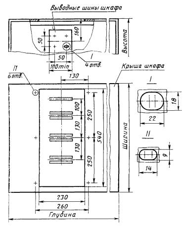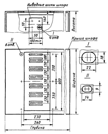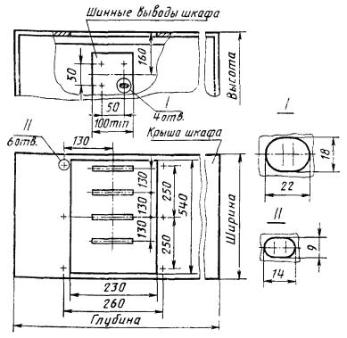 ПРИСОЕДИНИТЕЛЬНЫЕ РАЗМЕРЫ ШИННЫХ ВЫВОДОВ И ОТВЕРСТИЯ В КРЫШАХ ШКАФОВ РУНН КТП