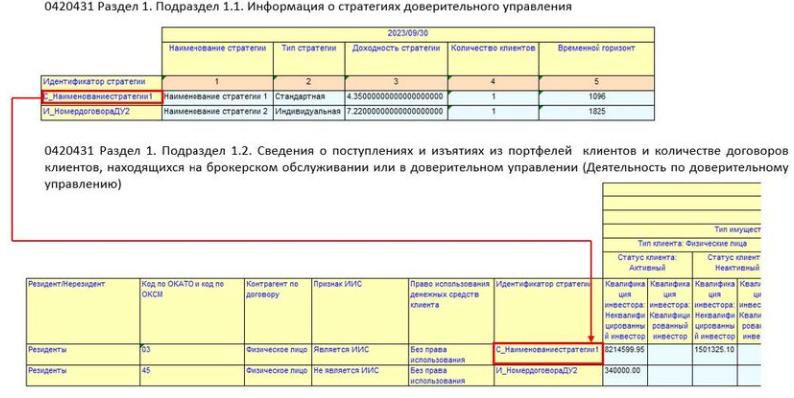 Кроме того, в подразделе 1.1 раздела 1 отчетности по форме 0420431 указание значения по показателю "Тип стратегии" и значения по группе аналитических признаков "Идентификатор стратегии" является обязательным для всех стратегий управления. Каждой стратегии управления по группе аналитических признаков "Идентификатор стратегии" присваивается уникальное значение и неизменное.