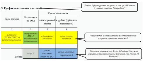 Раздел 5 "График исполнения платежей" формируется в случае необходимости отражения графика исполнения платежей по договорам операционной аренды (финансовой аренды), по гражданско-правовым договорам, предусматривающим отдельные этапы выполнения работ, услуг, по долгосрочным договорам, по иным доходам, поэтапно признаваемым в течение будущих периодов (периода действия договора) доходами текущего периода.