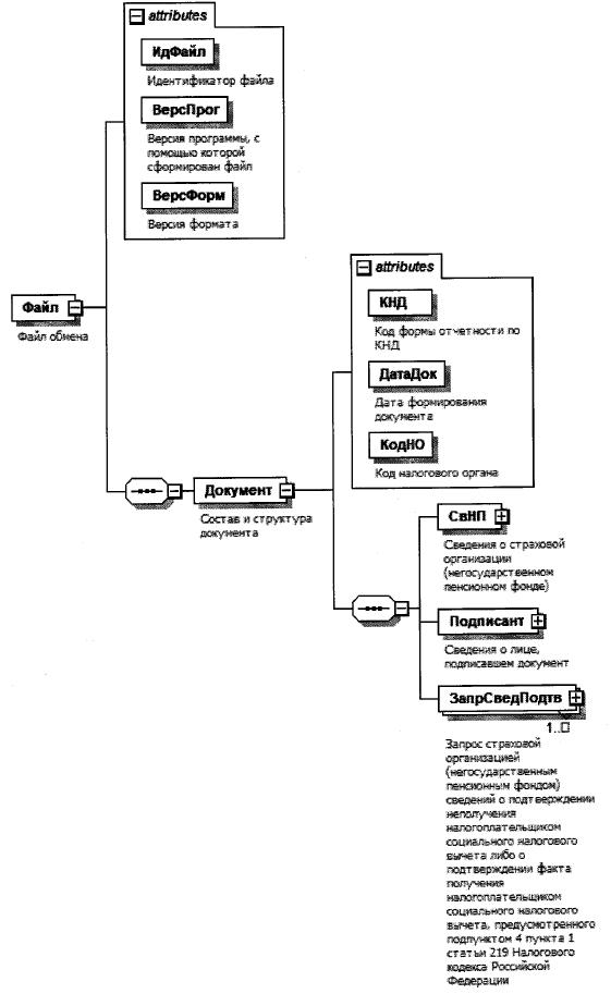 | Запрос страховой организацией (негосударственным пенсионным фондом) сведений о подтверждении неполучения налогоплательщиком социального налогового вычета либо о подтверждении факта получения налогоплательщиком социального налогового вычета, предусмотренного подпунктом 4 пункта 1 статьи 219 Налогового кодекса Российской Федерации | ЗапрСведПодтв | С | ОМ | Состав элемента представлен в таблице 4.7 |