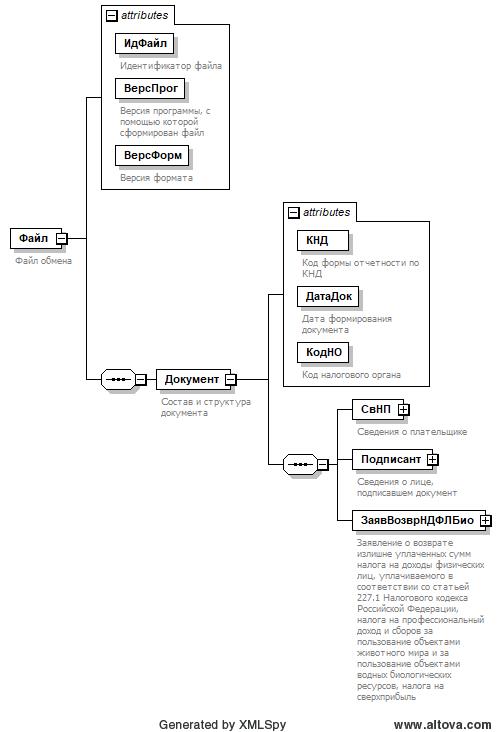 | Заявление о возврате излишне уплаченных сумм налога на доходы физических лиц, уплачиваемого в соответствии со статьей 227.1 Налогового кодекса Российской Федерации, налога на профессиональный доход и сборов за пользование объектами животного мира и за пользование объектами водных биологических ресурсов, налога на сверхприбыль | ЗаявВозврНДФЛБио | С | О | Состав элемента представлен в таблице 4.9 |