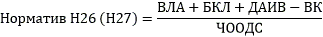Норматив Н26 (Н27) рассчитывается как отношение суммы высоколиквидных активов, лимита (лимитов) безотзывной кредитной линии (безотзывных кредитных линий) и высоколиквидных активов, номинированных в отдельных иностранных валютах, в части, превышающей чистый ожидаемый отток денежных средств в той же иностранной валюте, уменьшенной на величину корректировки высоколиквидных активов, к величине чистого ожидаемого оттока денежных средств по следующей формуле: