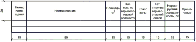 - в графе "Кат. пом. по взрывопожарной опасности" - категорию помещений по взрывопожарной и пожарной опасности. Категорию указывают для всех типов помещений производственных зданий и для помещений общественных зданий, в которых предусматривается нахождение горючих веществ и материалов согласно соответствующим нормативным документам;