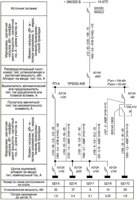 - линии питающей, распределительной, групповой сетей и сети управления освещением (в жилых домах - включая линии для электроплит и других бытовых электроприемников), их обозначения и, при необходимости, сечение, марку, способ прокладки;