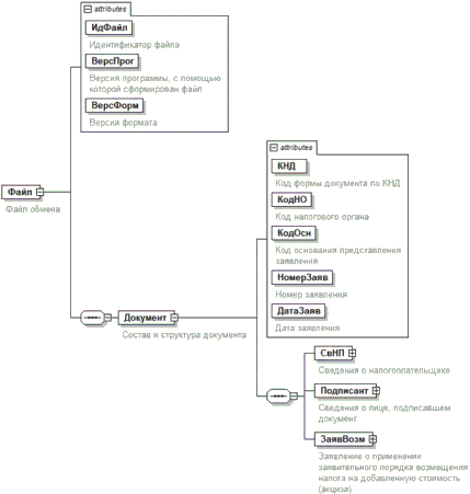 | Обязательства, предусмотренные заявительным порядком возмещения налога на добавленную стоимость, акциза | | ЗаявПор | С | НУ | Состав элемента представлен в таблице 4.12. Элемент обязателен, если <ВидГар> (из таблицы 4.10) принимает значение 01 | 02 (а также при значении 03 | 04 | 05 при отсутствии элемента <Обяз184.204>), и должен отсутствовать при остальных значениях <ВидГар> | |