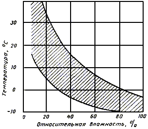 2.4. Измерения не проводят во время осадков, при скорости ветра более 5 м/с, а также при неблагоприятных сочетаниях температуры и относительной влажности окружающего воздуха, когда затухание звука в воздухе для третьоктавной полосы с центральной частотой 8 кГц превышает 10 дБ на 100 м. Зона неблагоприятных условий сочетания температуры и относительной влажности воздуха представлена на черт.1 в виде заштрихованного участка.
