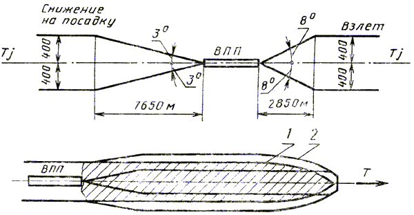 1 - контур шума, построенный для взлета самолета по идеальной прямой;