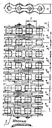 1 - промежуточная пластина; 2 - внутренняя пластина; 3 - ролик; 4 - втулка; 5 -наружная платина; 6 - валик ; 7 - шплинт; 8 - переходная платина