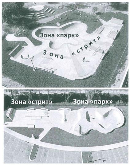 Рисунок Г.32а, лист 2. Компоновка зоны скейтбординга для дисциплин "стрит" и "парк" (примеры)".