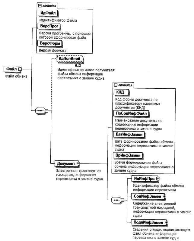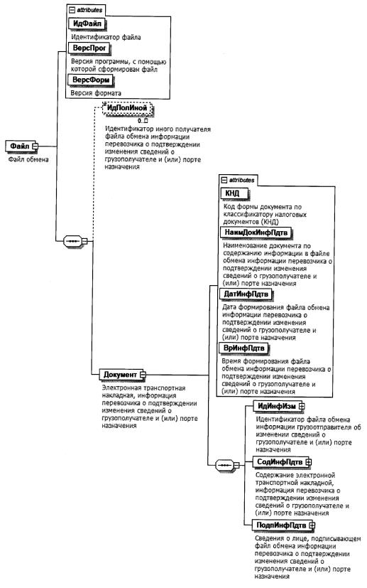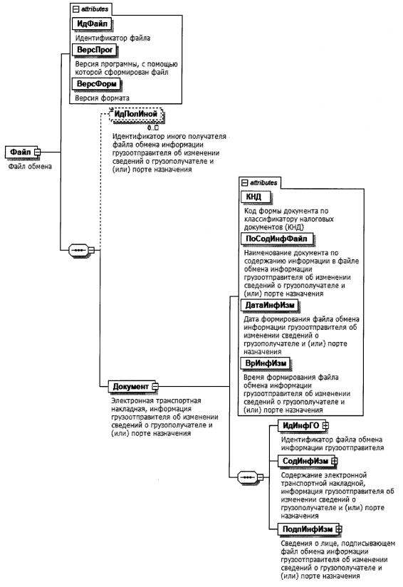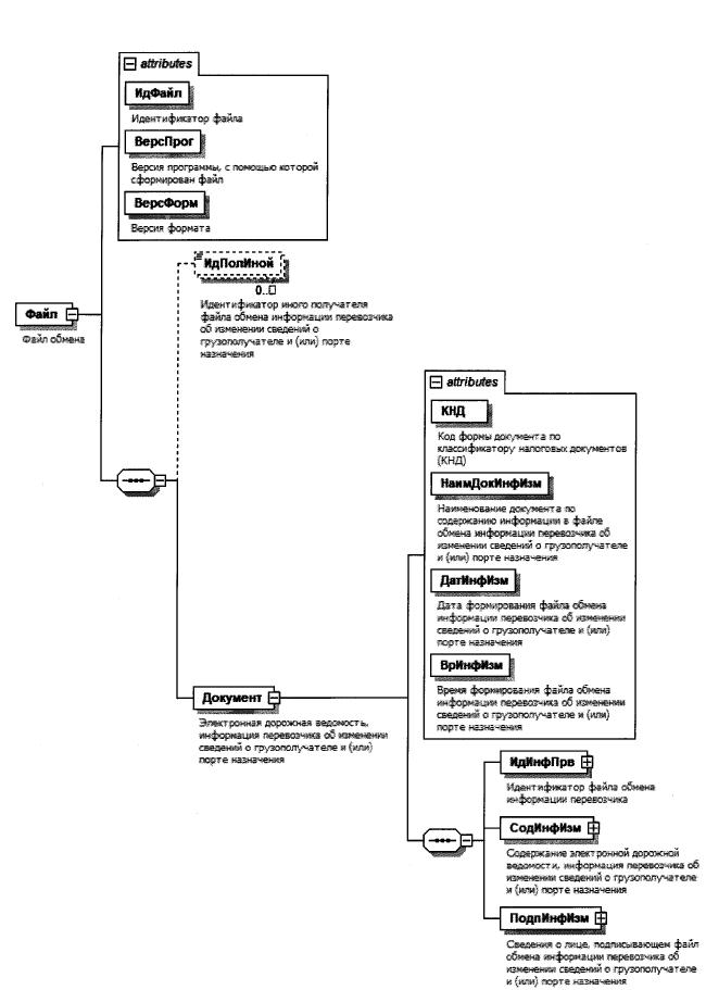 | Идентификатор файла обмена информации перевозчика об изменении сведений о грузополучателе и (или) порте назначения | ИдФайлИнфИзм | А | T(1-255) | О | Содержит (повторяет) имя файла обмена информации перевозчика об изменении сведений о грузополучателе и (или) порте назначения без расширения |