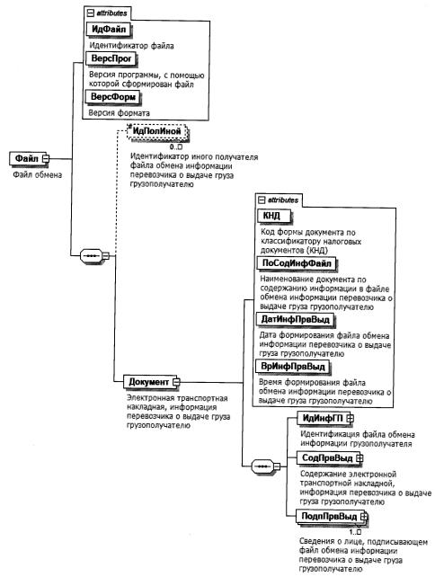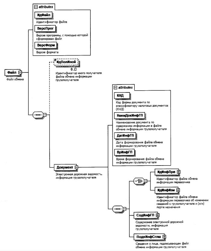 | Наименование документа по содержанию информации в файле обмена информации грузополучателя | НаимДокИнфГП | А | T(1-255) | ОК | Принимает значение: электронная дорожная ведомость, информация грузополучателя о получении груза |