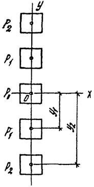 Ж.2.3.5. В расчетном центре располагают начало прямоугольных координат и размещают ось 0Y так, чтобы центры тяжести элементарных площадок (см. Ж.2.3.6), на которые разделены площади одного или нескольких следов опирания, располагались возможно ближе к этой оси.