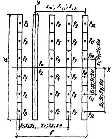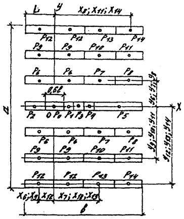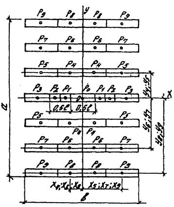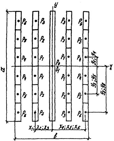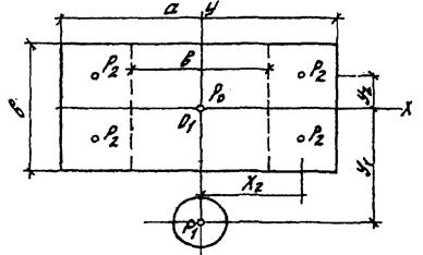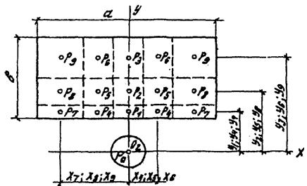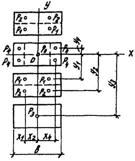 Ж.2.3.3. Для определения расчетного изгибающего момента при действии нагрузки сложного вида вычерчивают схему расположения следов опирания единичных нагрузок, действующих на элементарные площадки, располагая их относительно расчетного центра 0 (определяемое координатами X = Y = 0), или схему разделения следов нагрузок на элементарные площадки с указанием на каждой из них центра тяжести приложения нагрузки (см. рисунки Ж.1, Ж.2). Нагрузки, расположение которых на полу относительно расчетного центра может изменяться, следует располагать, по возможности, ближе к расчетному центру.