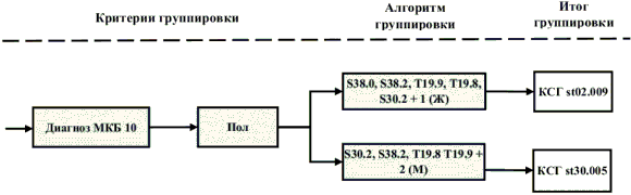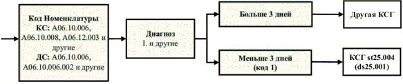 Данный способ предполагает, что базовая КСГ делится на подгруппы через разнесение кодов основных классификационных справочников (МКБ-10 и Номенклатура), используемых при формировании базовой КСГ.