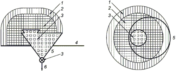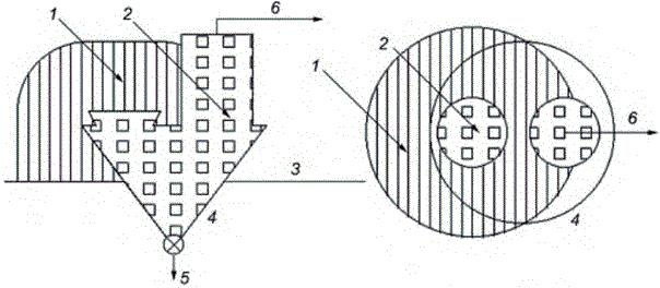 1 - зона класса 22, см. 6.2.4; 2 - зона класса 21, см. 6.2.3; 3 - зона класса 20, см. 6.2.2, 4 - основание, 5 - загрузочная воронка для мешков; 6 - к электрооборудованию через лопастной затвор
