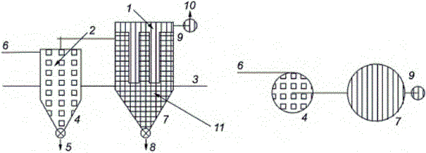 1 - зона класса 22, см. 6.2.4; 2 - зона класса 20, см. 6.2.2; 3 - основание; 4 - циклон; 5 - к бункеру продукта; 6 - вход; 7 - фильтр; 8 - к бункеру пыли; 9 - удаляющий вентилятор, 10 - к выходу; 11 - зона класса 21, см. 6.2.3