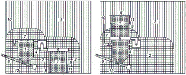 1 - зона класса 20, см. 6.2.2; 2 - зона класса 21, см. 6.2.3; 3 - зона класса 22, см. 6.2.4; 4 - загрузочная воронка; 5 - мембранный клапан; 6 - винтовой конвейер; 7 - люк загрузочной воронки; 8 - барабанная платформа; 9 - гидравлические цилиндры; 10 - стена; 11 - барабан; 12 - основание
