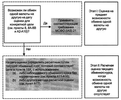 19A Организация должна определить расчетным путем текущий обменный курс на дату оценки, когда возможность обмена одной валюты на другую валюту отсутствует (как описано в пунктах 8, 8A - 8B и A2 - A10) на эту дату. Цель, которую преследует организация при таком определении текущего обменного курса, - отразить тот курс, по которому была бы осуществлена обычная сделка обмена валют на дату оценки между участниками рынка в превалирующих экономических условиях.