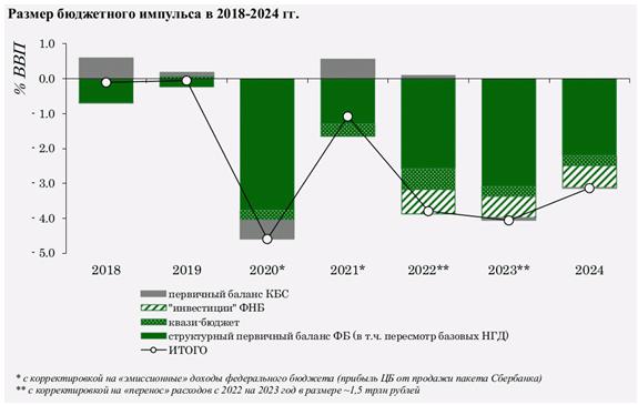 Оценка бюджетного импульса включает как бюджетные операции, так и "квази-бюджетные" операции под чертой - такие как предоставление бюджетных и межгосударственных кредитов, инвестиции ФНБ в финансовые активы российских организаций.
