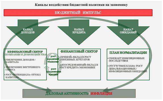 Бюджетный импульс транслируется в экономику (за счет влияния на деловую активность и инфляцию) посредством трех каналов: