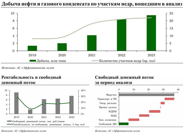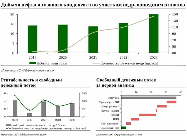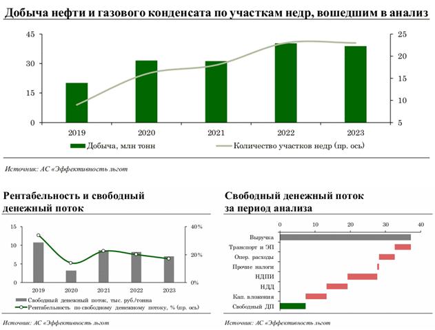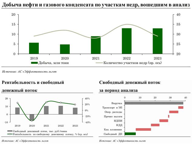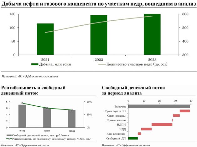 По итогам анализа совокупная доля добычи нефти и газового конденсата на "красных" и "желтых" участках недр в 4 группе НДД оценивается в 85,6% (6,3 млн тонн), в том числе 5,6% "красных" и 80,0% "желтых". Полученные результаты свидетельствуют о том, что экономика разработки участков недр в 4 группе НДД является более благоприятной по сравнению с экономикой добычи нефти на участках недр, находящихся на общей системе налогообложения. Это формирует стимулы для замещения добычи, не применяющей налоговые льготы, той добычей, в отношении которой применяются налоговые льготы, предусмотренные в рамках 4 группы НДД.