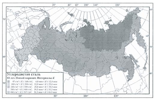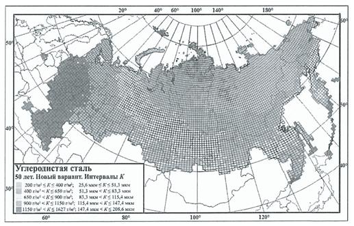 Э.2 Оценка величин коррозионных потерь углеродистой стали и цинкового покрытия после 50 лет эксплуатации конструкций на континентальной территории Российской Федерации