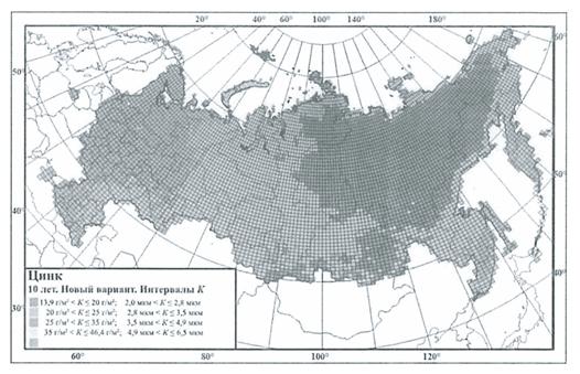 Рисунок Э.3 - Карта континентальной территории России по интервалам расчетных коррозионных потерь горячего цинкового покрытия за 10 лет при среднегодовой концентрации диоксида серы, равной 0,005 мг/м3