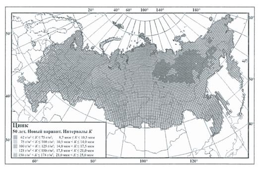 Рисунок Э.4 - Карта континентальной территории России по интервалам расчетных коррозионных потерь горячего цинкового покрытия за 50 лет при среднегодовой концентрации диоксида серы, равной 0,005 мг/м3