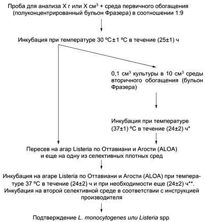 Метод выявления бактерий L. monocytogenes и других видов Listeria (Listeria spp.) в определенной массе или объеме продукта, а также на определенной площади поверхности производственной окружающей среды состоит из четырех последовательных этапов (см. 5.1, 5.2, 5.3, 5.4 и приложение А).