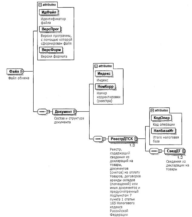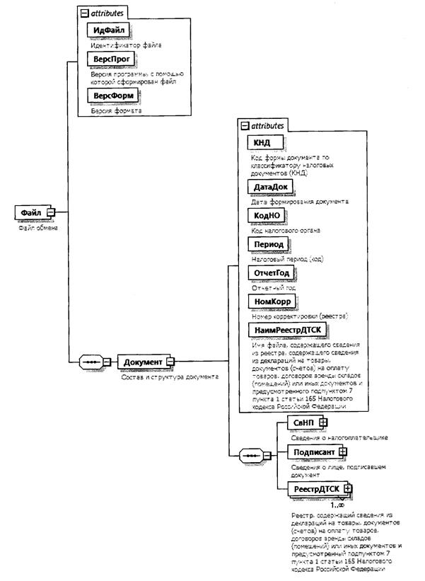 | Реестр, содержащий сведения из деклараций на товары, документов (счетов) на оплату товаров, договоров аренды складов (помещений) или иных документов и предусмотренный подпунктом 7 пункта 1 статьи 165 Налогового кодекса Российской Федерации | РеестрДТСК | С | ОМ | Состав элемента представлен в таблице 4.9 |