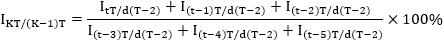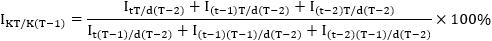 - индекс цен за отчетный квартал K отчетного года T к соответствующему кварталу K предыдущего года T - 1, %;