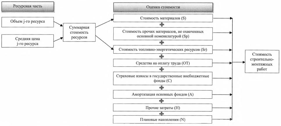 Общая стоимость строительно-монтажных работ определяется как сумма стоимостей используемых материальных и трудовых ресурсов, а также других затрат, включаемых в ресурсно-технологическую модель.