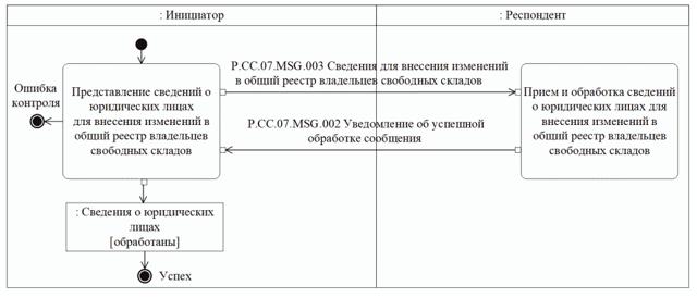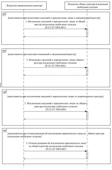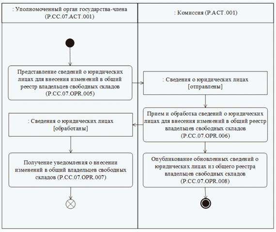 В случае если в процессе внесения изменений в национальный реестр изменяется регистрационный номер документа, подтверждающего включение сведений о юридических лицах в национальный реестр, то представление сведений о юридических лицах осуществляется с использованием 2 процедур: "Исключение сведений о юридических лицах из общего реестра владельцев свободных складов" (P.CC.07.PRC.003) и "Включение сведений о юридических лицах в общий реестр владельцев свободных складов" (P.CC.07.PRC.001).