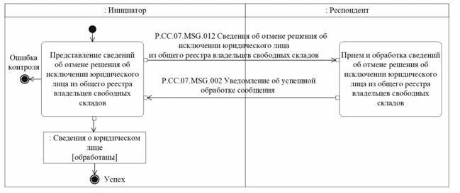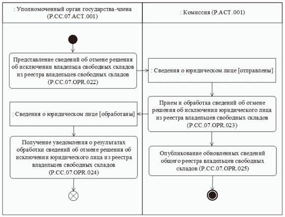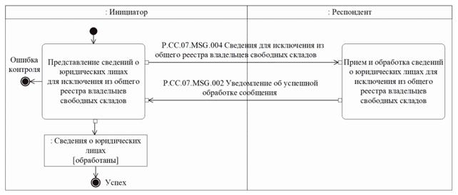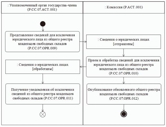 При исключении сведений о юридических лицах из национального реестра выполняется процедура "Исключение сведений о юридических лицах из общего реестра владельцев свободных складов" (P.CC.07.PRC.003).