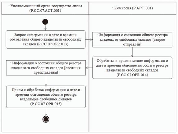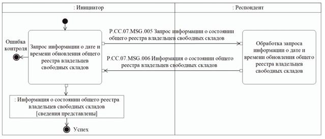Запрос на представление информации о дате и времени обновления общего реестра владельцев свободных складов выполняется уполномоченным органом государства-члена в целях оценки необходимости синхронизации хранящихся в информационной системе уполномоченного органа государства-члена сведений о юридических лицах, включенных в общий реестр владельцев свободных складов, со сведениями о юридических лицах, содержащимися в общем реестре владельцев свободных складов, хранящимися в Комиссии. При осуществлении запроса на представление информации о дате и времени обновления общего реестра владельцев свободных складов выполняется процедура "Получение информации о дате и времени обновления общего реестра владельцев свободных складов" (P.CC.07.PRC.004).