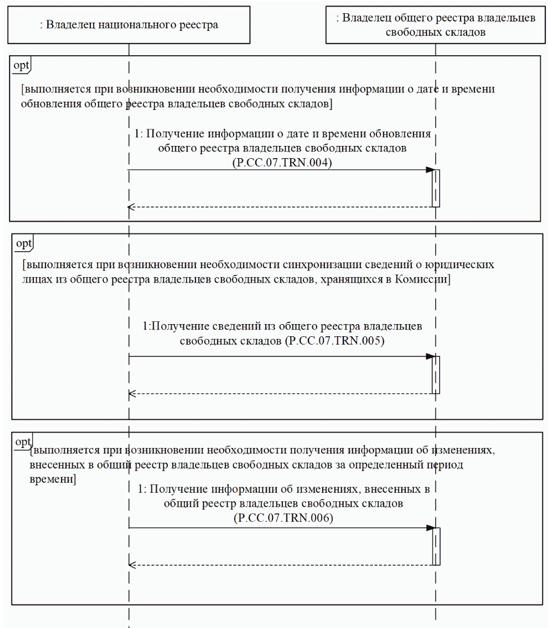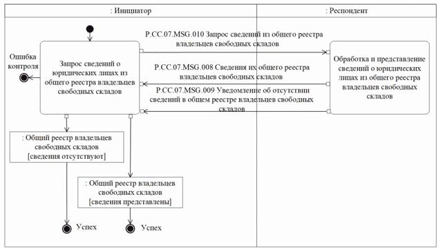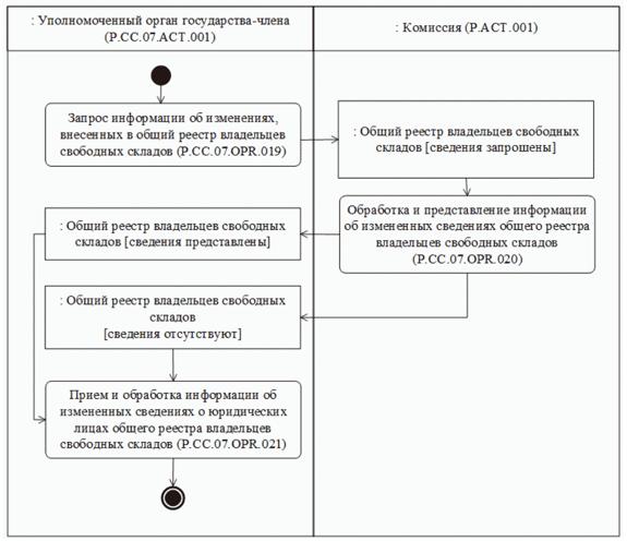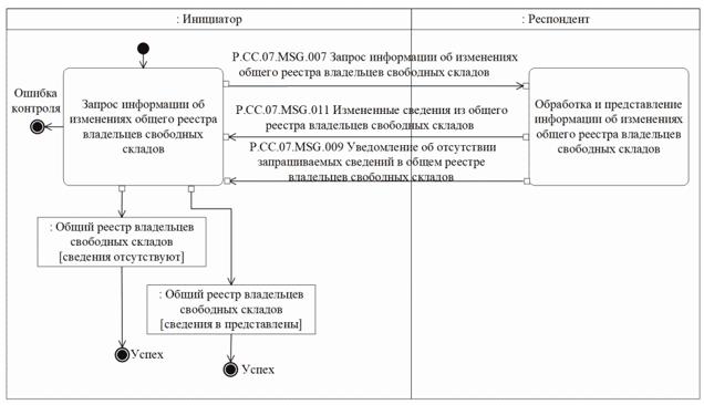 При запросе информации об изменениях, внесенных в общий реестр владельцев свободных складов, представляются сведения о юридических лицах, которые были добавлены в общий реестр владельцев свободных складов или в которые были внесены изменения начиная с момента, указанного в запросе, до момента выполнения этого запроса. При осуществлении запроса на представление информации об изменениях, внесенных в общий реестр владельцев свободных складов, выполняется процедура "Получение информации об изменениях, внесенных в общий реестр владельцев свободных складов" (P.CC.07.PRC.006).