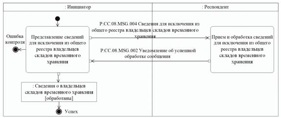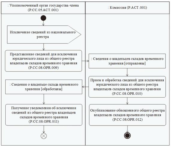При передаче сведений об исключении юридического лица из национального реестра выполняется процедура "Исключение сведений из общего реестра владельцев складов временного хранения" (P.CC.08.PRC.003).