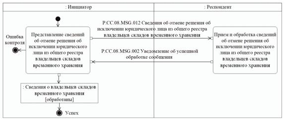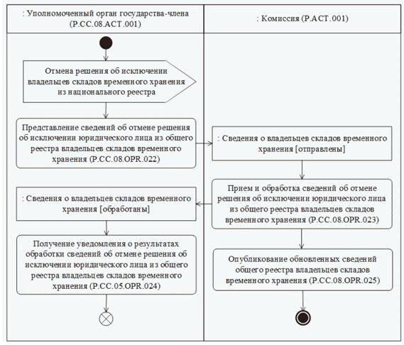 При передаче сведений об отмене решения об исключении юридического лица из национального реестра выполняется процедура "Отмена решения об исключении юридического лица из общего реестра владельцев складов временного хранения" (P.CC.08.PRC.008).