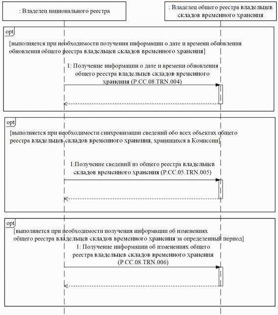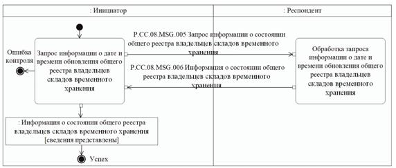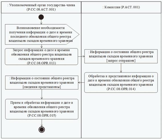 Запрос информации о дате и времени обновления общего реестра владельцев складов временного хранения выполняется уполномоченным органом государства-члена в целях оценки необходимости синхронизации хранящихся в информационной системе уполномоченного органа государства-члена сведений о владельцах складов временного хранения, включенных в общий реестр владельцев складов временного хранения, со сведениями, содержащимися в общем реестре владельцев складов временного хранения и хранящимися в Комиссии. При осуществлении запроса выполняется процедура "Получение информации о дате и времени обновления общего реестра владельцев складов временного хранения" (P.CC.08.PRC.004).