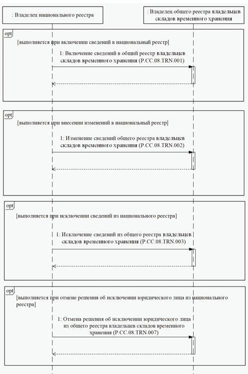 В случае если в процессе внесения изменений в национальный реестр изменяется регистрационный номер документа, подтверждающего включение юридического лица в национальный реестр, то представление сведений осуществляется с использованием 2 процедур: "Исключение сведений из общего реестра владельцев складов временного хранения" (P.CC.08.PRC.003) и "Включение сведений в общий реестр владельцев складов временного хранения" (P.CC.08.PRC.001).