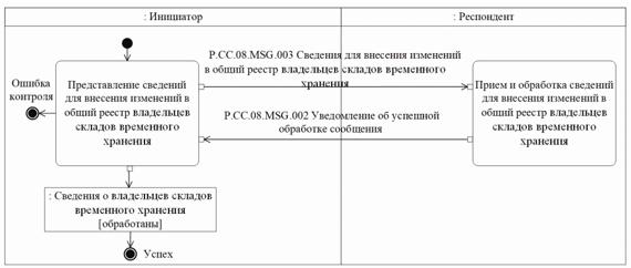 При передаче сведений об изменениях, внесенных в национальный реестр (в случае изменения сведений о юридическом лице, заявленных при включении его в общий реестр владельцев складов временного хранения), выполняется процедура "Изменение сведений, содержащихся в общем реестре владельцев складов временного хранения" (P.CC.08.PRC.002).