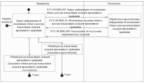 При запросе информации об изменениях, внесенных в общий реестр владельцев складов временного хранения представляются сведения, которые были добавлены в общий реестр владельцев складов временного хранения или в которые были внесены изменения, начиная с момента, указанного в запросе, до момента выполнения этого запроса. При осуществлении запроса выполняется процедура "Получение информации об изменениях, внесенных в общий реестр владельцев складов временного хранения" (P.CC.08.PRC.006).