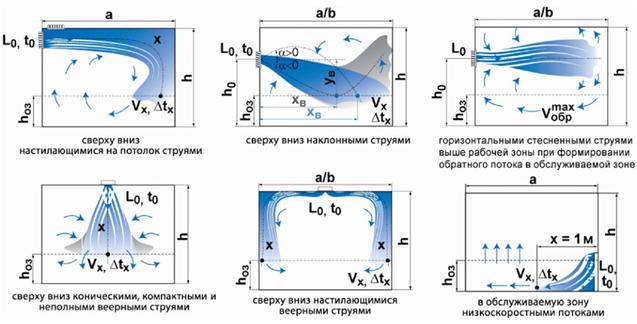 При подаче нагретого воздуха проверяется условие сохранения вида струи расчетом расстояния до точки торможения (вершины струи):