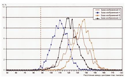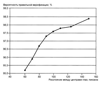 Расстояние между центрами глаз (т.е. пространственное разрешение изображения) является наиболее важным критерием для успешного распознавания лица. Для оценки влияния расстояния между центрами глаз при распознавании лица проведены исследования на изображениях с различным разрешением при использовании современного алгоритма сравнения лиц. На рисунке D.7 показано увеличение вероятности правильной верификации при увеличении расстояния между центрами глаз. Данные результаты применимы для оценки эффективности поиска "один-ко-многим" (ранговая статистика).