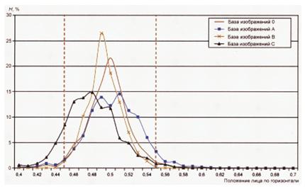 Рисунок D.2 - Нормированное распределение положения лица по горизонтали на исследуемых паспортных фотографиях;