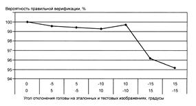 В автоматических системах распознавания лица эффективно проводится коррекция угла отклонения головы на изображении. На рисунке D.8 показана зависимость вероятности правильной верификации от угла отклонения головы.