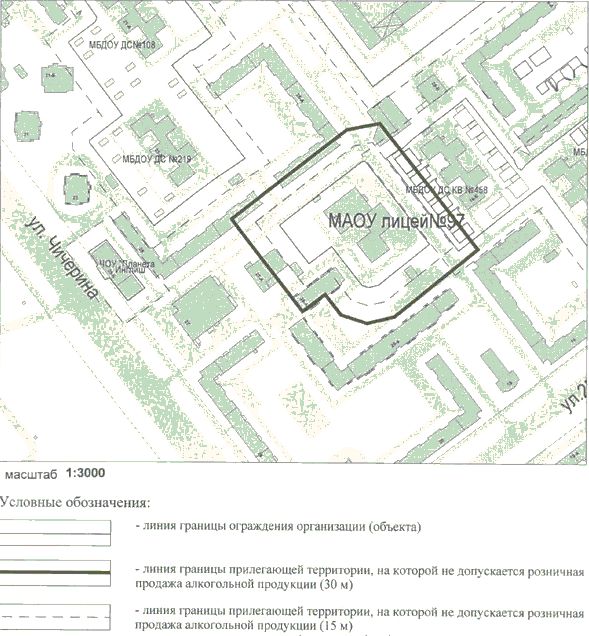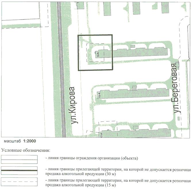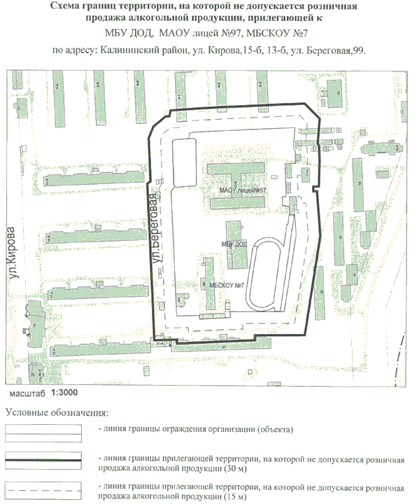 СХЕМА ГРАНИЦ ТЕРРИТОРИИ, НА КОТОРОЙ НЕ ДОПУСКАЕТСЯ РОЗНИЧНАЯ ПРОДАЖА АЛКОГОЛЬНОЙ ПРОДУКЦИИ, ПРИЛЕГАЮЩЕЙ К МБУ ДОД, МАОУ ЛИЦЕЙ N 97, МБСКОУ N 7 ПО АДРЕСУ: Г. ЧЕЛЯБИНСК, КАЛИНИНСКИЙ РАЙОН, УЛ. КИРОВА 15-Б, 13-Б, УЛ. БЕРЕГОВАЯ, 99.