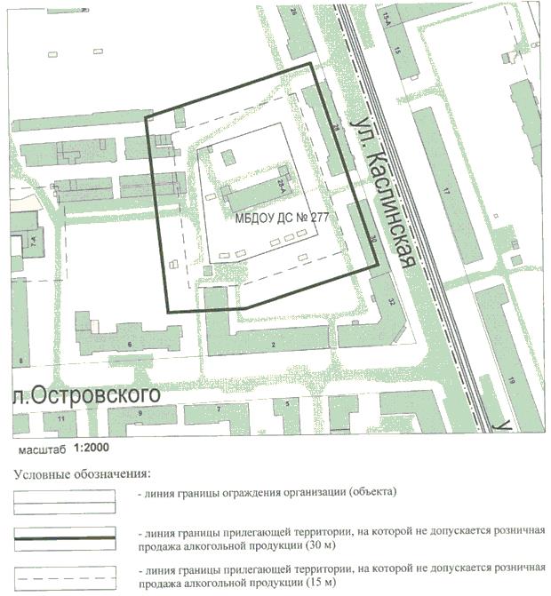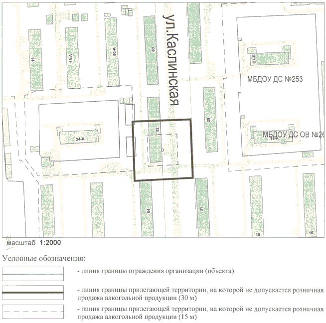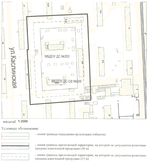 СХЕМА ГРАНИЦ ТЕРРИТОРИИ, НА КОТОРОЙ НЕ ДОПУСКАЕТСЯ РОЗНИЧНАЯ ПРОДАЖА АЛКОГОЛЬНОЙ ПРОДУКЦИИ, ПРИЛЕГАЮЩЕЙ К МБДОУ ДС N 253, МБДОУ БС ОВ N 265 ПО АДРЕСУ: Г. ЧЕЛЯБИНСК, КАЛИНИНСКИЙ РАЙОН, УЛ. КАСЛИНСКАЯ, 27-Б, 29-А.